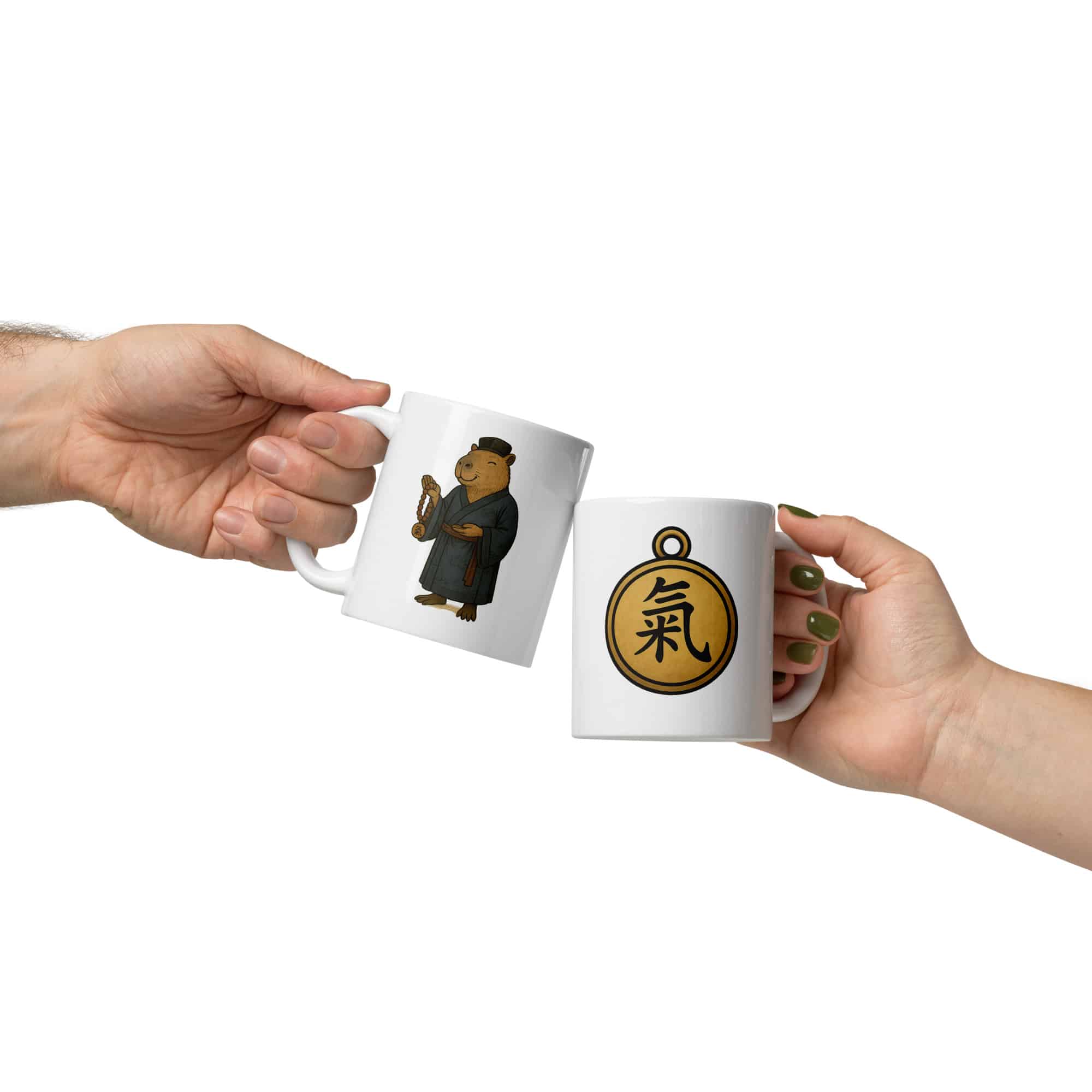 Start your day with peace, balance, and a touch of Taoist wisdom. This sturdy white ceramic mug features a serene capybara in traditional Taoist garb, holding prayer beads and embodying the “gesture of the open heart.” On the opposite side, the bold Qi pendant symbol (“氣”) reminds you that energy flows best when it’s calm and connected.