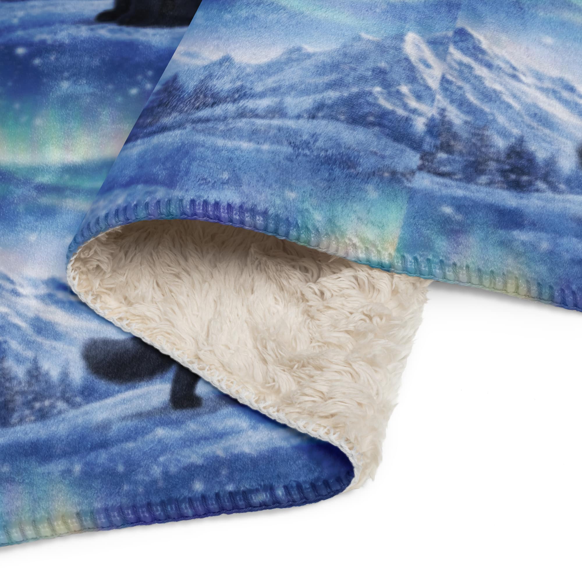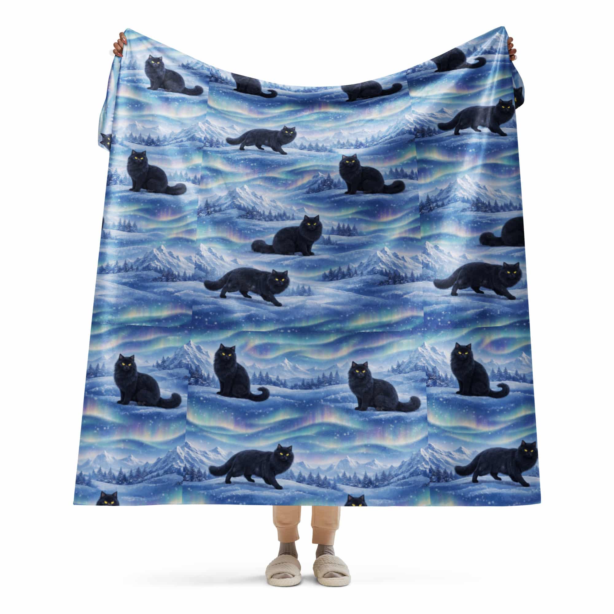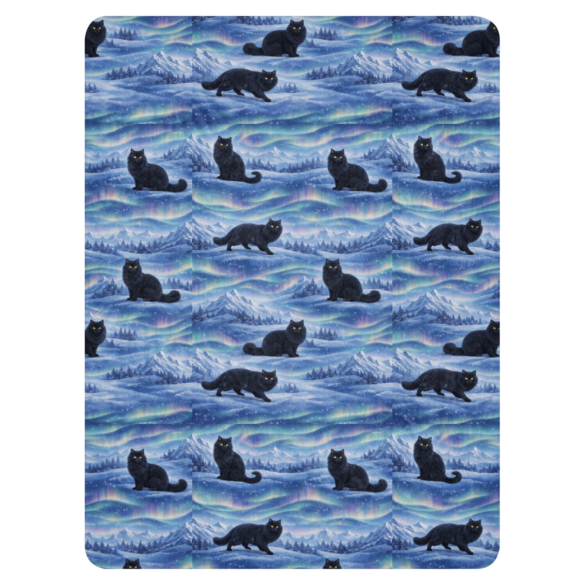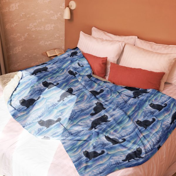 Nordic Black Cat Sherpa Blanket – Aurora & Winter Mountain