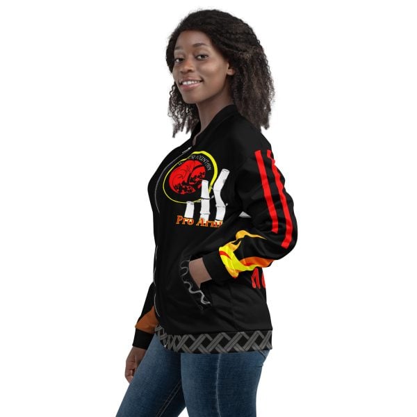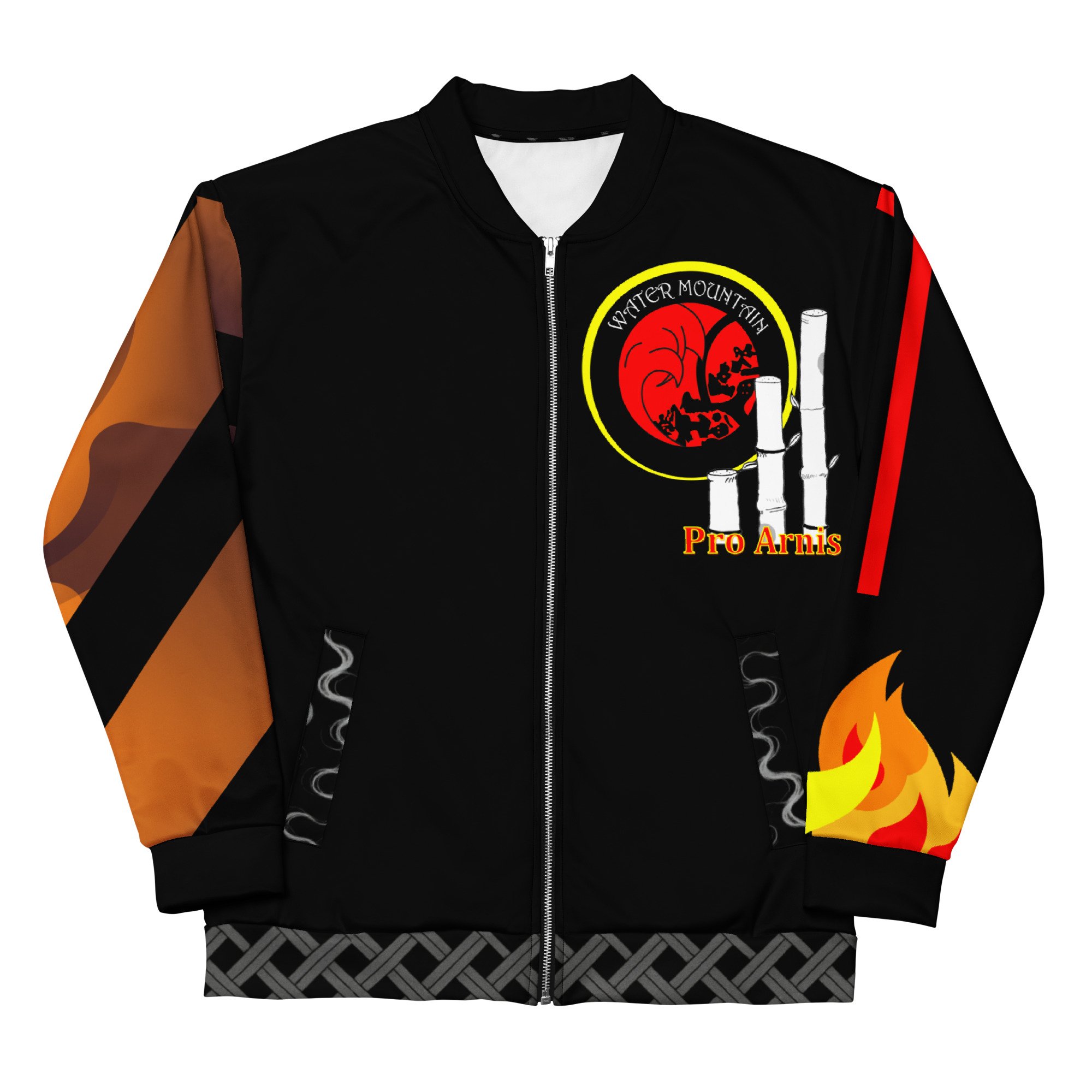 Step into the fight with style and heritage in the Pro Arnis Blood Stripe Bomber Jacket. Inspired by the discipline and tradition of Filipino martial arts, this all-over print jacket combines bold graphics with functional comfort. The striking blood-stripe sleeve, bamboo motifs, and custom rattan trim ground the design in Pro Arnis culture while giving it a modern streetwear edge.