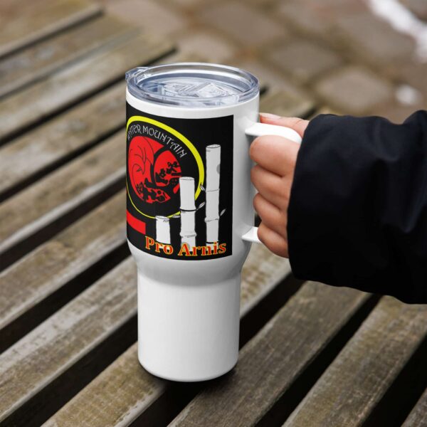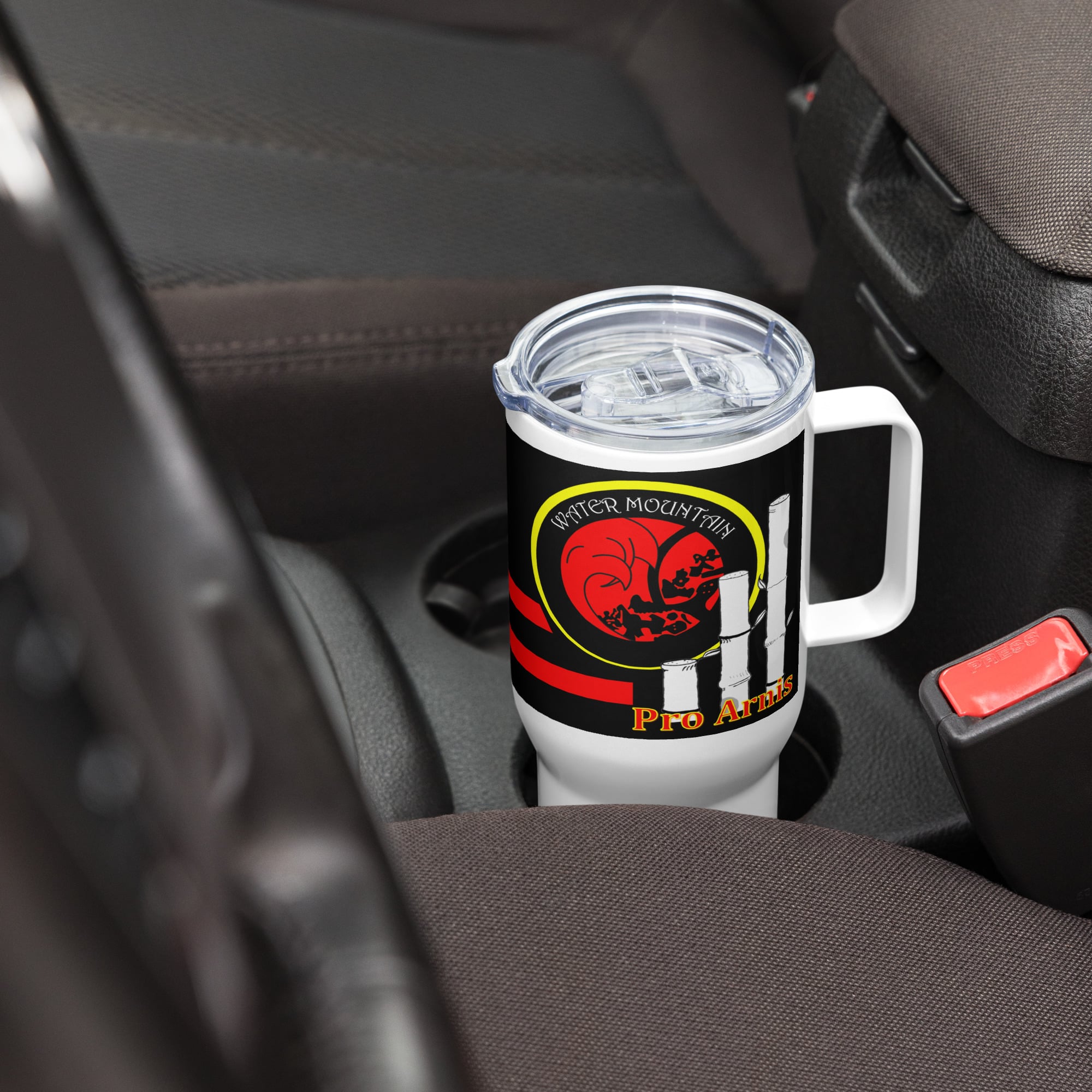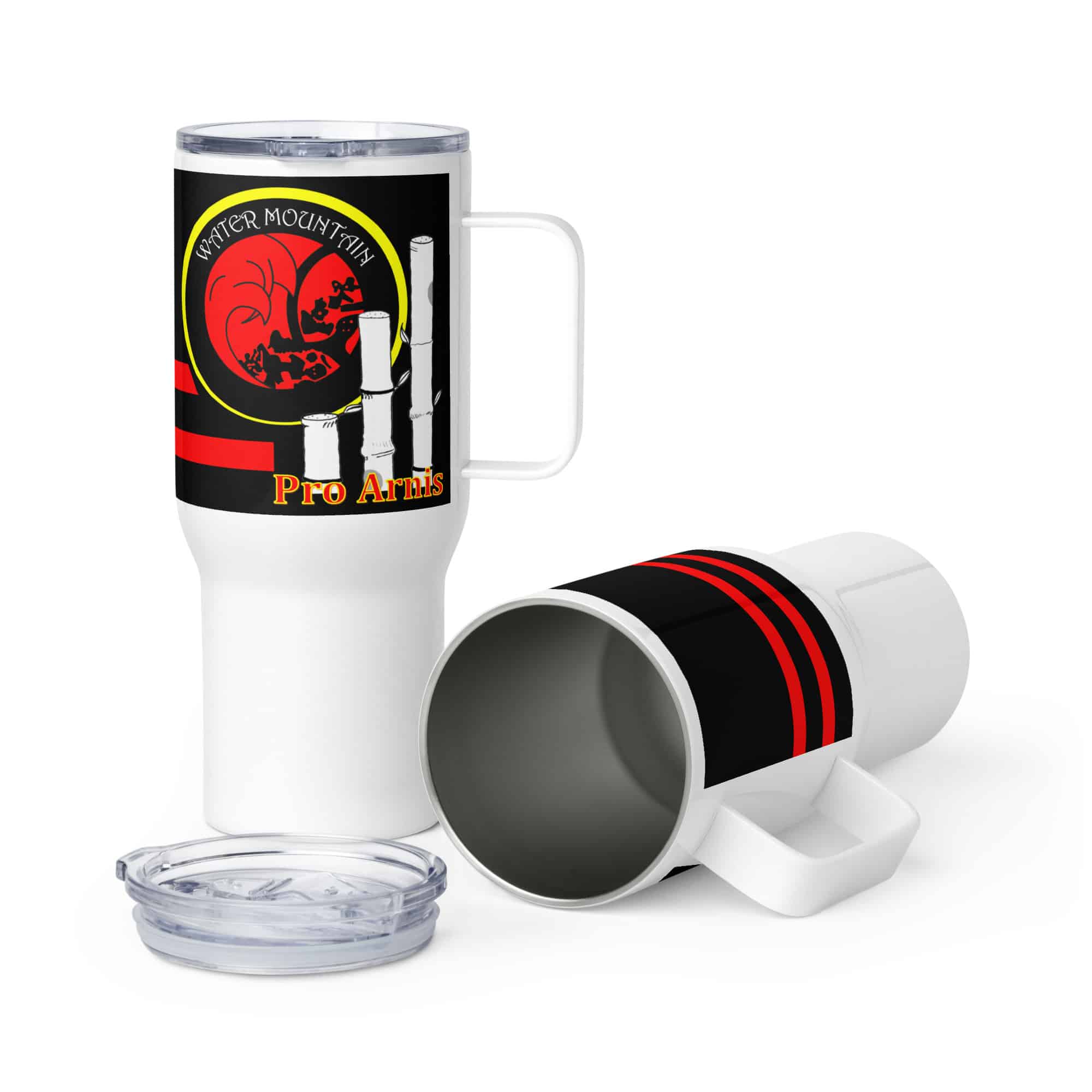 Take your martial arts spirit with you wherever you go. This 25oz Pro Arnis travel mug combines durability with sleek design, featuring the bold Water Mountain insignia and striking red-and-black wraparound graphic. Made from stainless steel and designed to fit most car cup holders, it’s the perfect companion for training days, commutes, and long road trips. The spill-proof plastic lid keeps your drink secure, while the insulated build maintains your beverage at just the right temperature.
