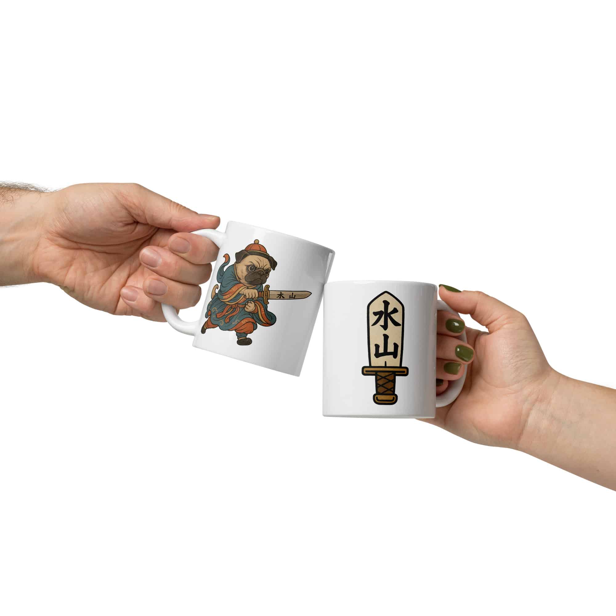 Start your day with the spirit of a warrior. This sturdy white ceramic mug features the Water Mountain pug warrior in full traditional garb on one side and the sword motif inscribed with 水山 (“Water Mountain”) on the other. Whether you’re enjoying morning coffee, evening tea, or anything in between, it’s designed to inspire strength with every sip.