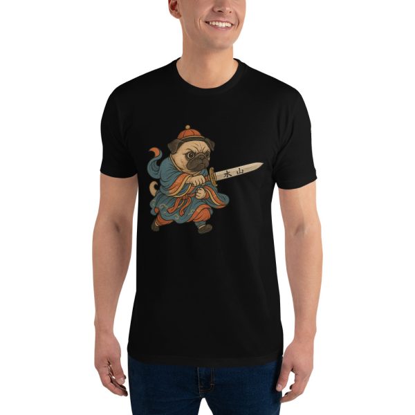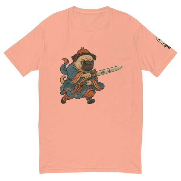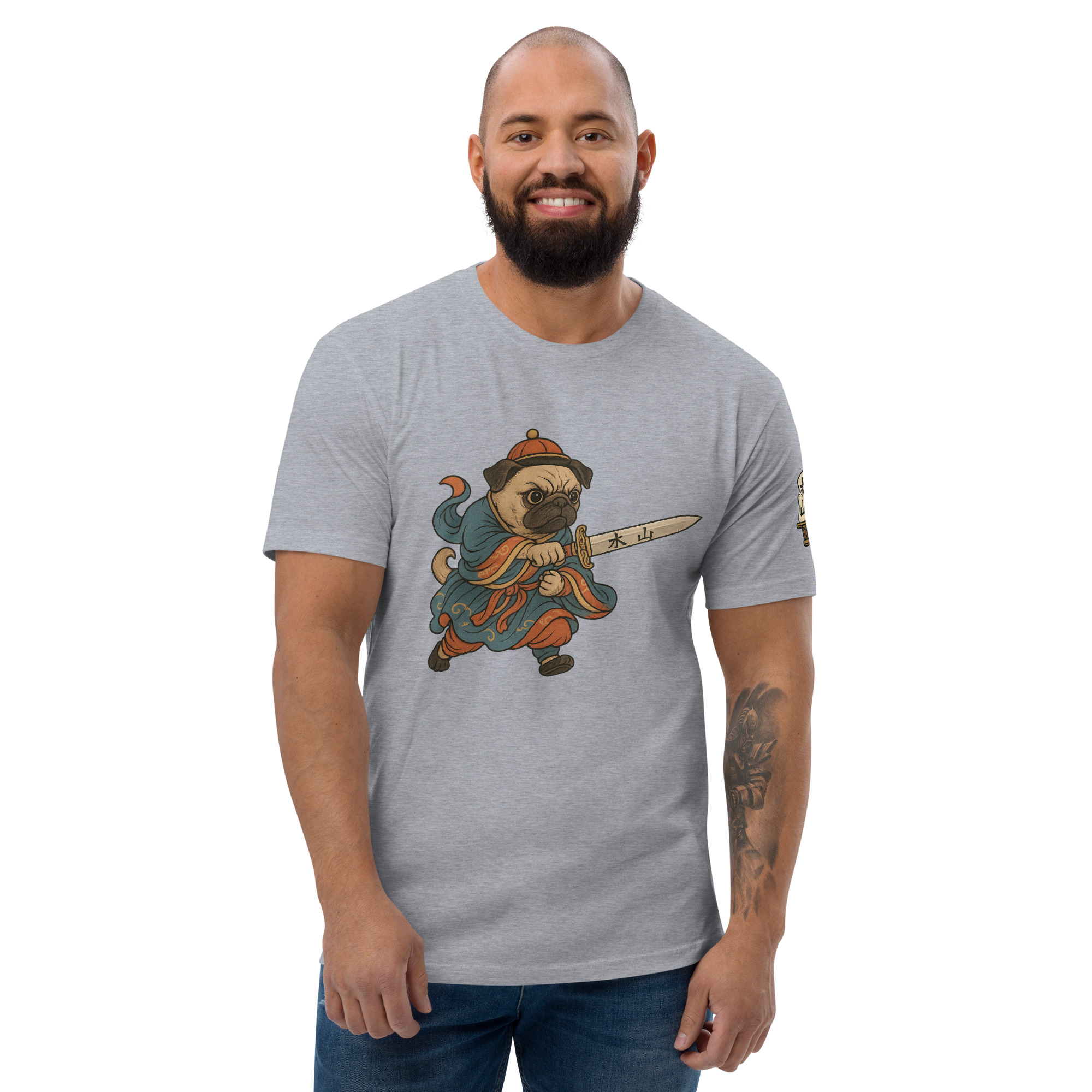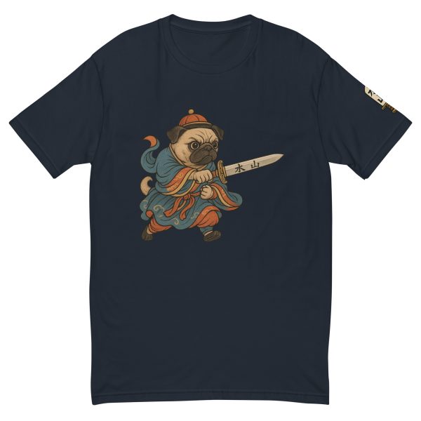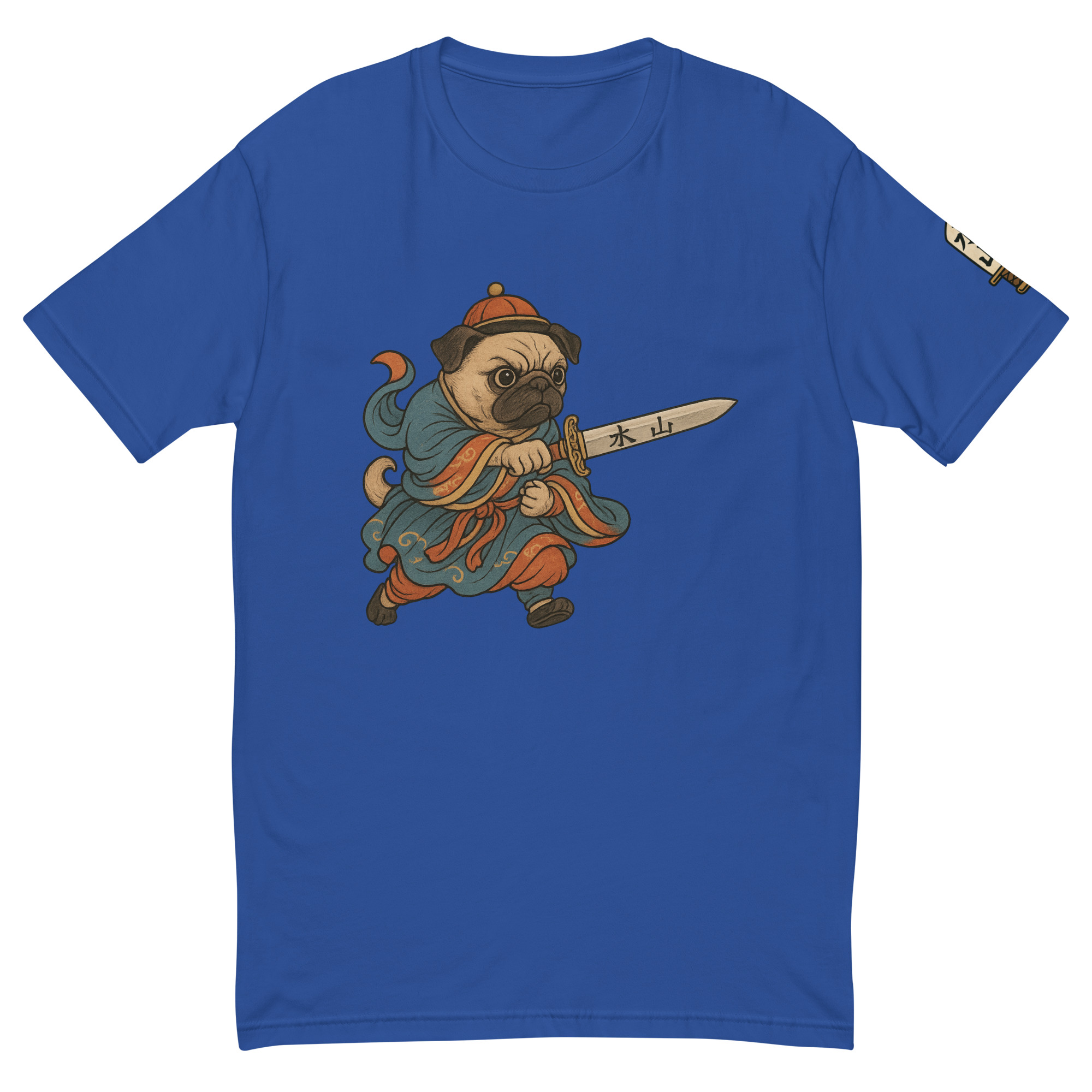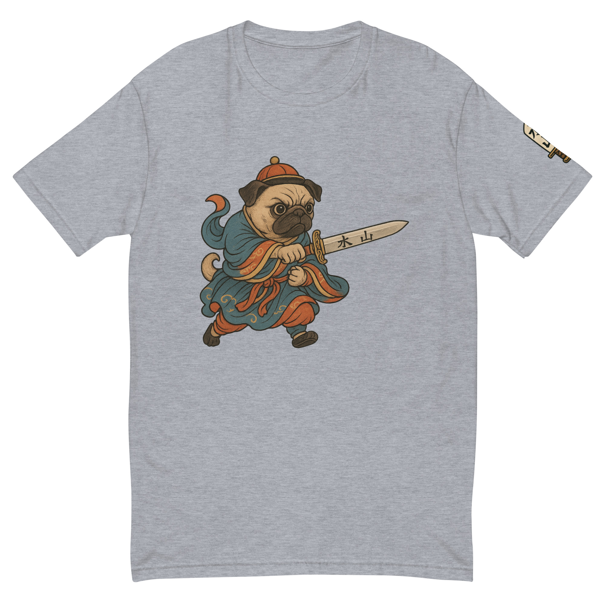 Step onto the path of the warrior with this bold Water Mountain tee. Featuring our pug warrior in traditional Chinese garb thrusting forward with a sword across the full chest, it’s both playful and powerful. On the left sleeve, the sword motif inscribed with 水山 (“Water Mountain”) ties into our extensive sword program, giving the design a martial edge that fans will recognize instantly. This striking design pairs perfectly with the cat warrior, making it a must-have for martial arts fans and Water Mountain students alike.